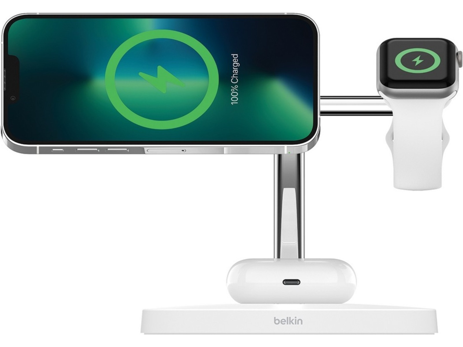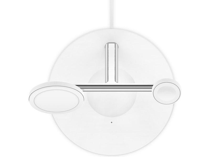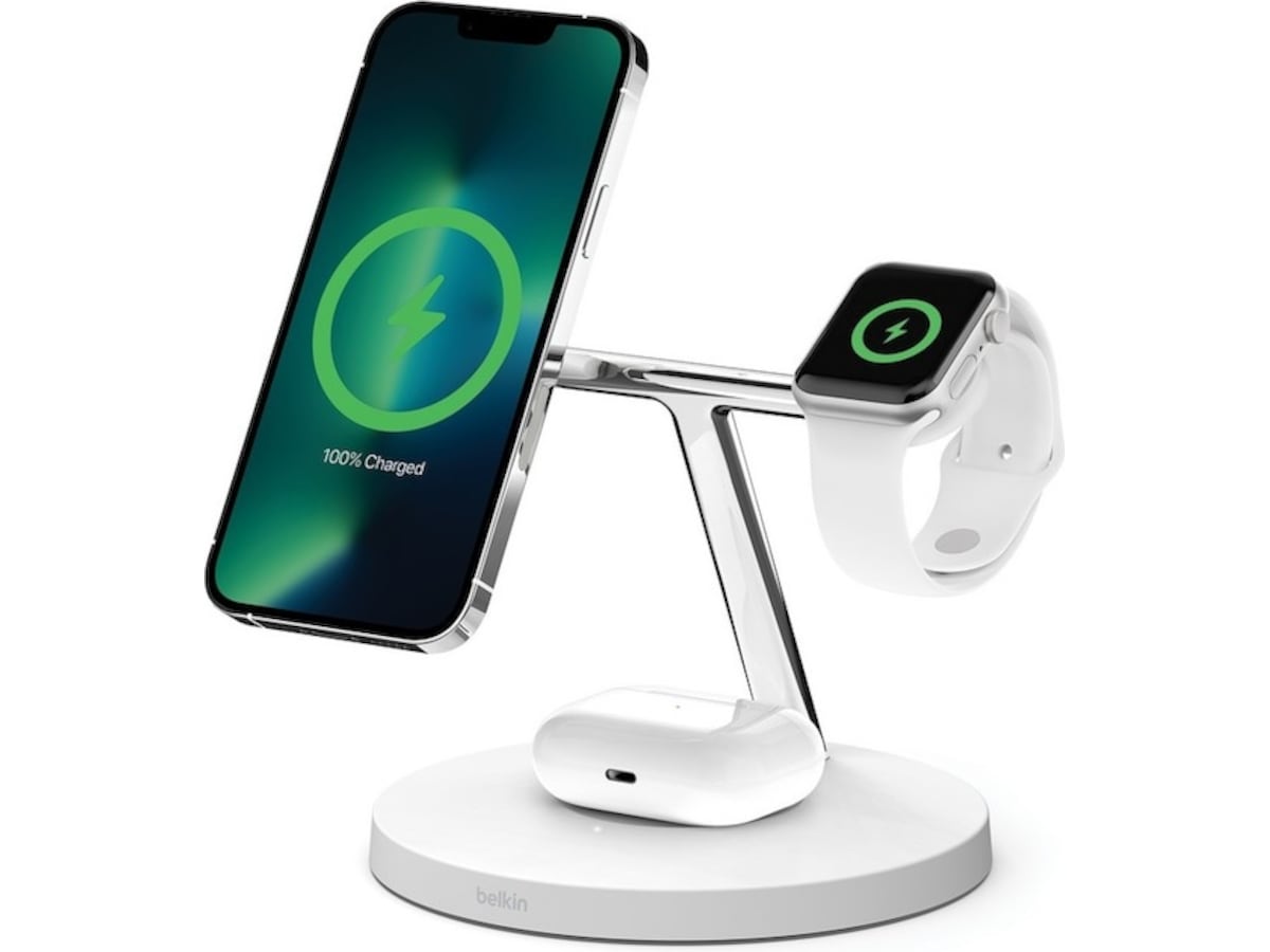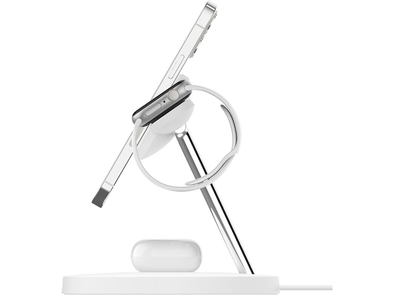 Et MagSafe-ladestativ på 15 watt gir strøm til din iPhone og en kraftig magnetisk lademodul lader din Apple Watch, mens en praktisk plate gir strøm til dine AirPods.