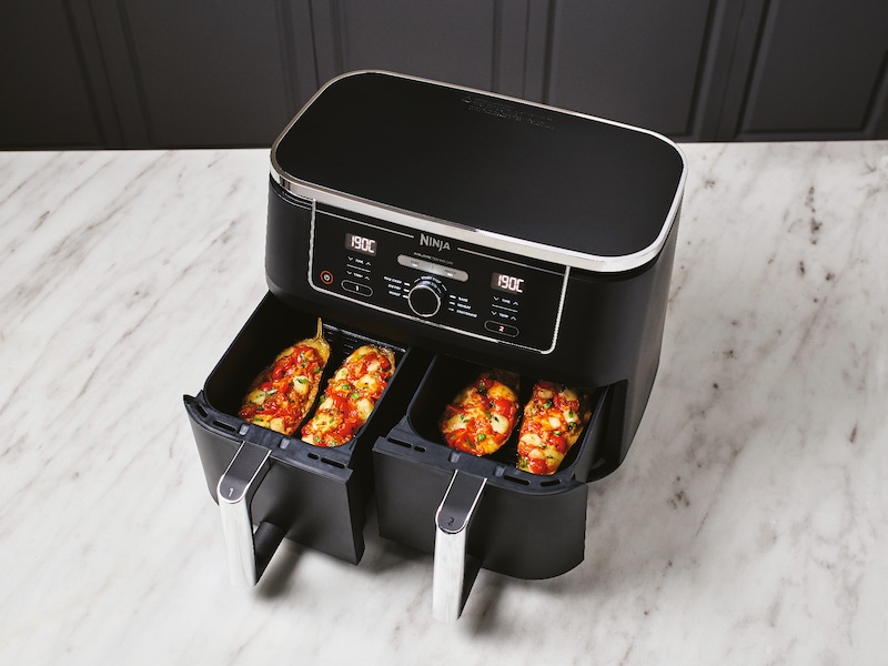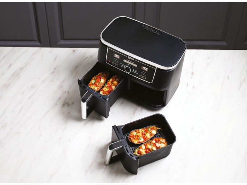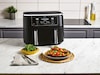 MAKSIMERE måltider med denne airfryeren med stor kapasitet som tilbereder to matvarer på to måter og gjør dem klare samtidig.