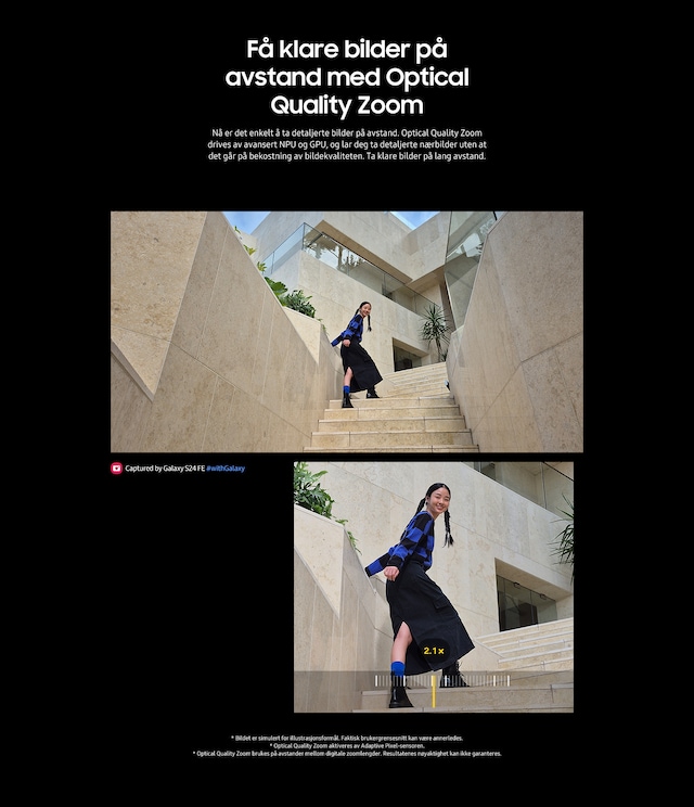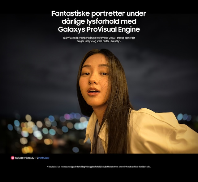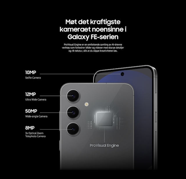 Galaxy S24 FE er utstyrt med de kraftigste kameraene i Galaxy FE-serien, mens ProVisual Engine – en samling av AI-drevne verktøy – gir optimaliserte bilder.
