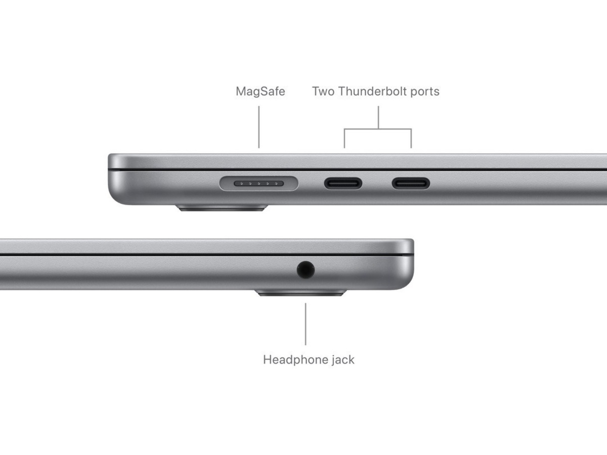• FULLKONTAKT – MacBook Air har to Thunderbolt-porter, en hodetelefonutgang, wifi 6E,(4) Bluetooth 5.3 og en MagSafe-ladeport. Koble til opptil to eksterne skjermer med maskinen lukket.
