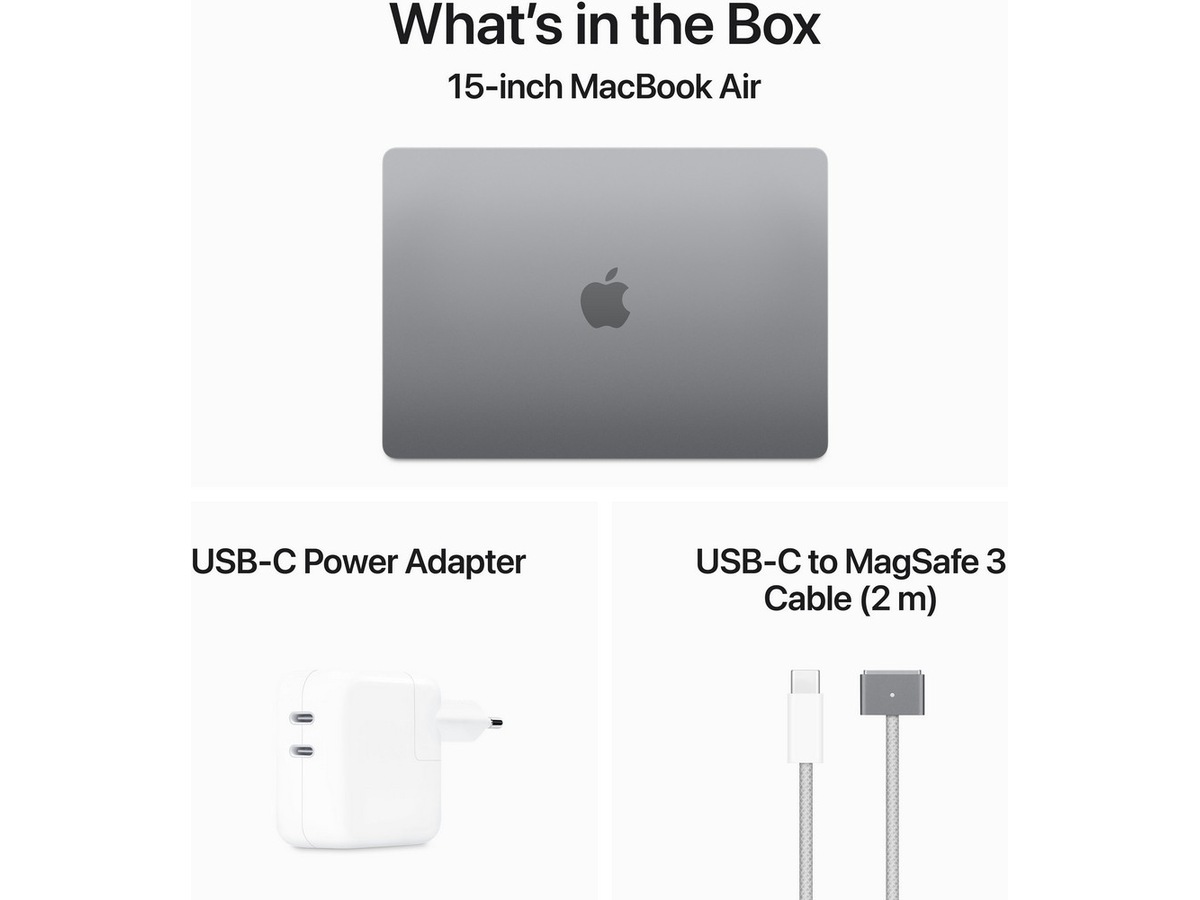 Inkludert tilbehør USB-C kompakt strømadapter med to porter, USB-C til MagSafe 3-ladekabel (2 m)