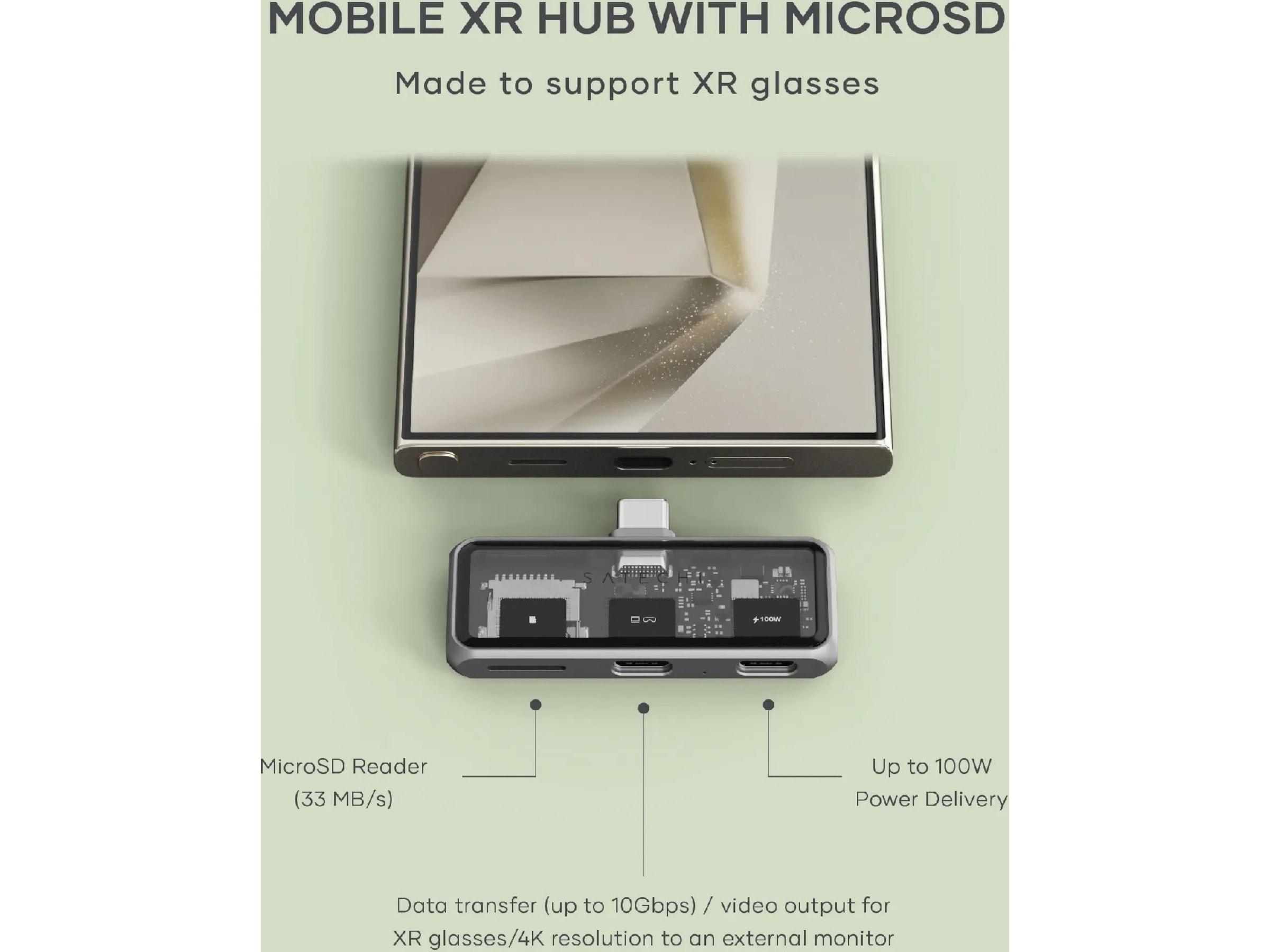 Embrace the full potential of XR technology - enhance your mobile gaming, streaming, and productivity experience. The Satechi Mobile XR Hub with microSD enhances your mobile experience by providing wide-ranging connectivity options in a compact, portable design. Whether moving large files or working between devices, the Mobile XR Hub ensures you're constantly plugged into what matters most. Expand your storage, connect essential devices, and streamline your workflow effortlessly with this sleek hub accessory.
