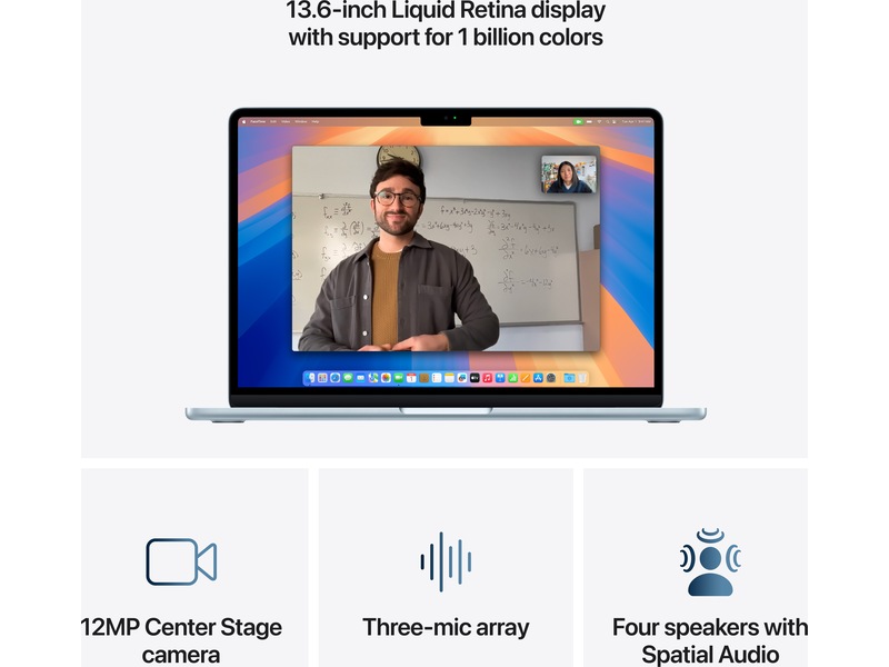 Kan konfigureres på flere måter.1) Batteritiden varierer avhengig av bruk og konfigurasjon. Mer informasjon finner du på apple.com/no/batteries. 2) Skjermen på 13 tommers MacBook Air har avrundede hjørner øverst. Målt som diagonalen i et rektangel er skjermen 13,6 tommer (den faktiske skjermflaten er noe mindre). 3) Wifi 6E er tilgjengelig i land og regioner der det støttes. 4) Appene finnes i App Store. Programvare og innhold selges muligens separat. Utvalget kan endres. 5) FaceTime er ikke tilgjengelig i alle land og regioner.