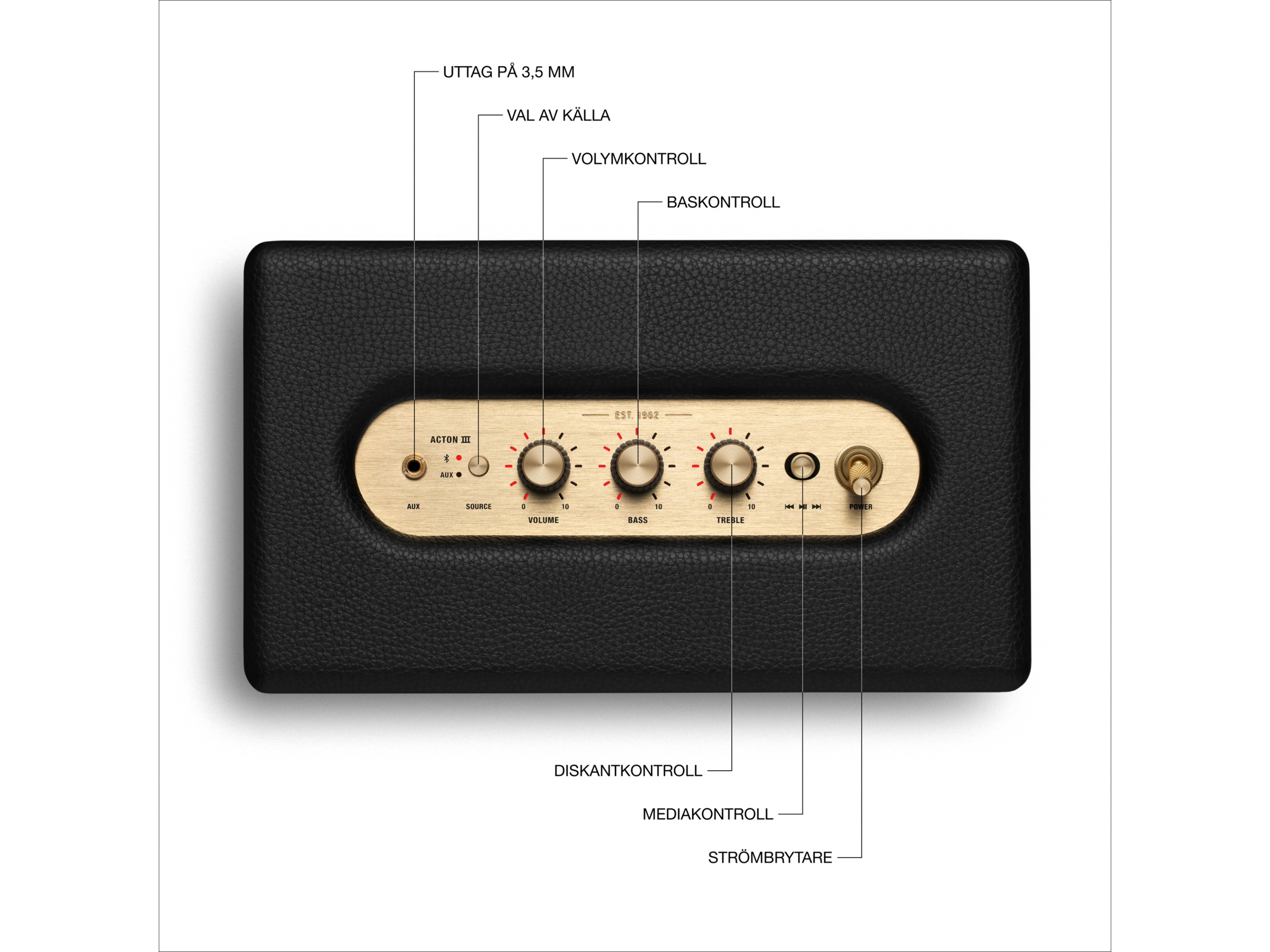 Kontroller Bass, Volum, Avspille/pause, Inngangsvelger, Hoppe over, Strøm på/av, Diskant