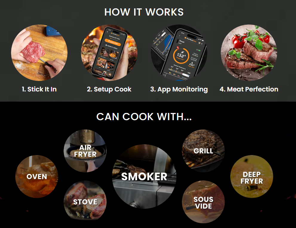 Forbedre matlagingen med The MeatStick App, din smarte sous-chef. Den tilbyr proff-funksjoner: CookTime™ smarte varsler, veiledet kokeliste, intuitivt grensesnitt og Cook Notes (kun iOS). Unngå over- eller undertilberedning med sanntidsovervåking. Fungerer på iOS/Android, til og med Apple Watch, for full matlagingsfrihet.