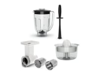 Pakkeinnhold Tilbehør for grønnsakskutting, Skivetrommel, Blender, Skyver, Sitruspressetilbehør, Grovraspetrommel, Stamper, Medium raspe trommel
