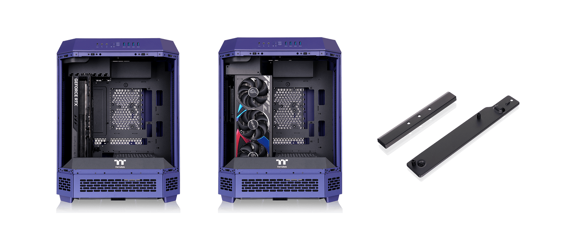 Roterende PCI-E-spor lar deg montere grafikkortet ditt på flere måter. To ekstra GPU-braketter gir ekstra støtte for GPU og riserkabler. (Riserkabel selges separat)