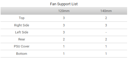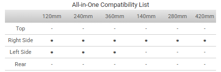 Støtter opptil en 420 mm radiator på høyre og en 360 mm radiator på venstre side