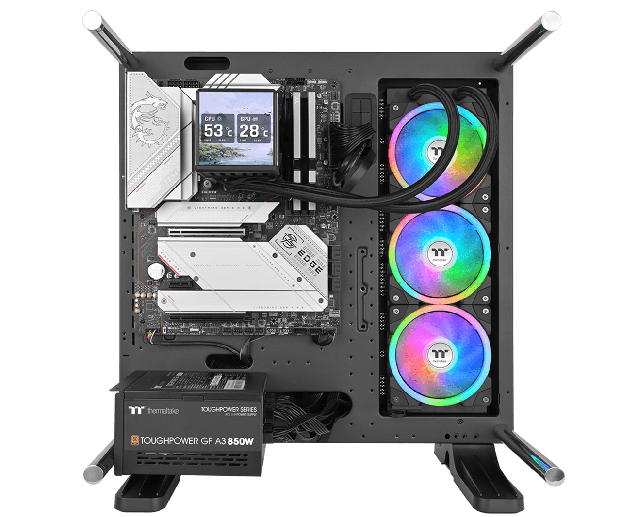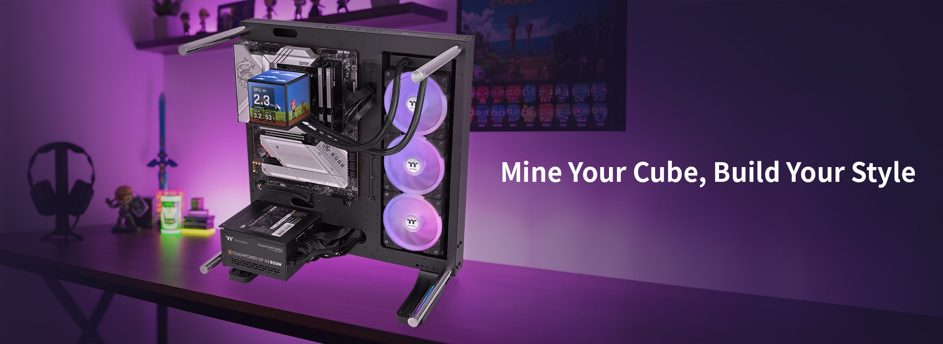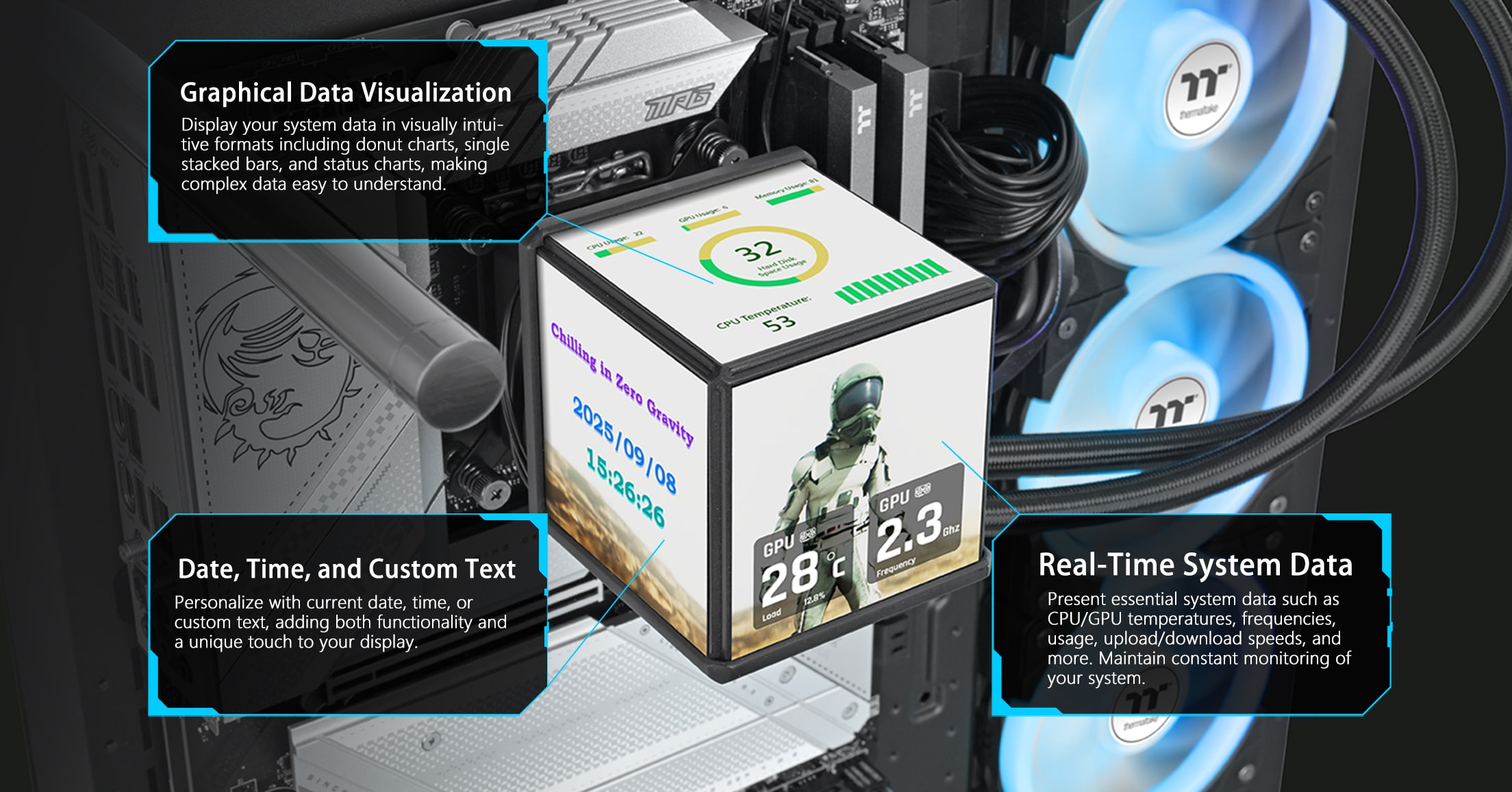MINECUBE 360 Ultra ARGB Sync har en patentert Quad-LCD Cube-skjerm, bestående av fire 3,95" TFT LCD-er. Hver LCD-skjerm viser uavhengig systeminformasjon eller egendefinerte visuelle elementer, med mulighet for å integreres i en multiskjermskonfigurasjon for helhetlige illustrasjoner. Denne avanserte AIO-væskekjøleren er utstyrt med SWAFAN EX-vifter med MAGForce 2.0 Quick Connection Design og utskiftbare vifteblader, noe som effektivt reduserer kabelrot samtidig som den optimaliserer dobbeltrings RGB-belysning i ulike luftstrømskonfigurasjoner.
