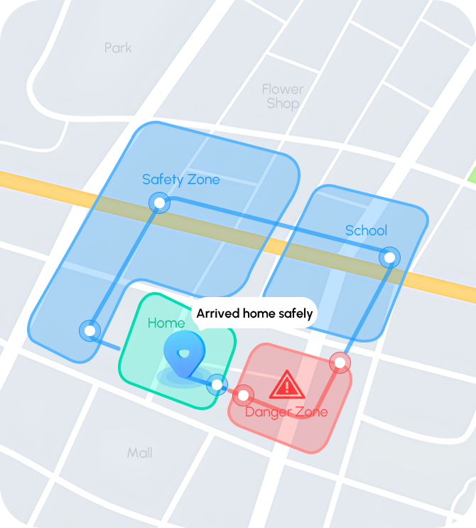 Øk barnets sikkerhet med to viktige funksjoner: konfigurasjon av sikker sone og identifisering av faresoner. Opprett en definert grense rundt enheten for varsling ved avgang, eller angi flere begrensede områder for å motta varsler ved innpassering.