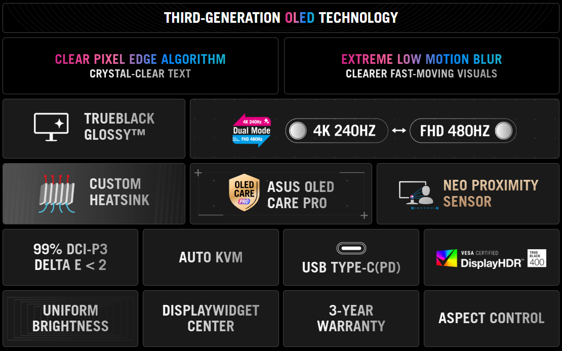 ROG OLED-skjermer er konstruert for langvarig visuell kvalitet. Den innovative tilpassede kjøleribben og proprietære interne luftstrømdesignet forbedrer termisk håndtering og minimerer risikoen for innbrenning. Hver ROG-skjerm leveres med en omfattende treårsgaranti.