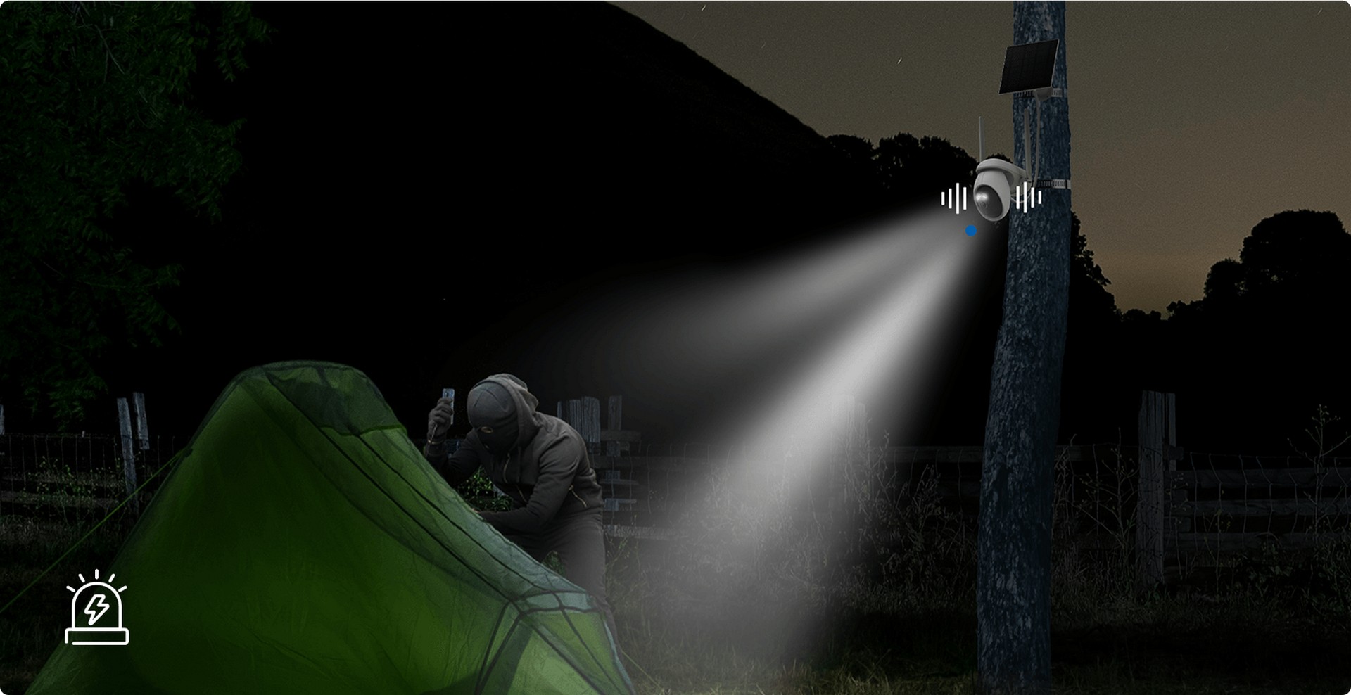 Avskrekk uautorisert tilgang med tilpassbare lydvarsler og justerbar dobbel spotlysintensitet for presis belysningskontroll.