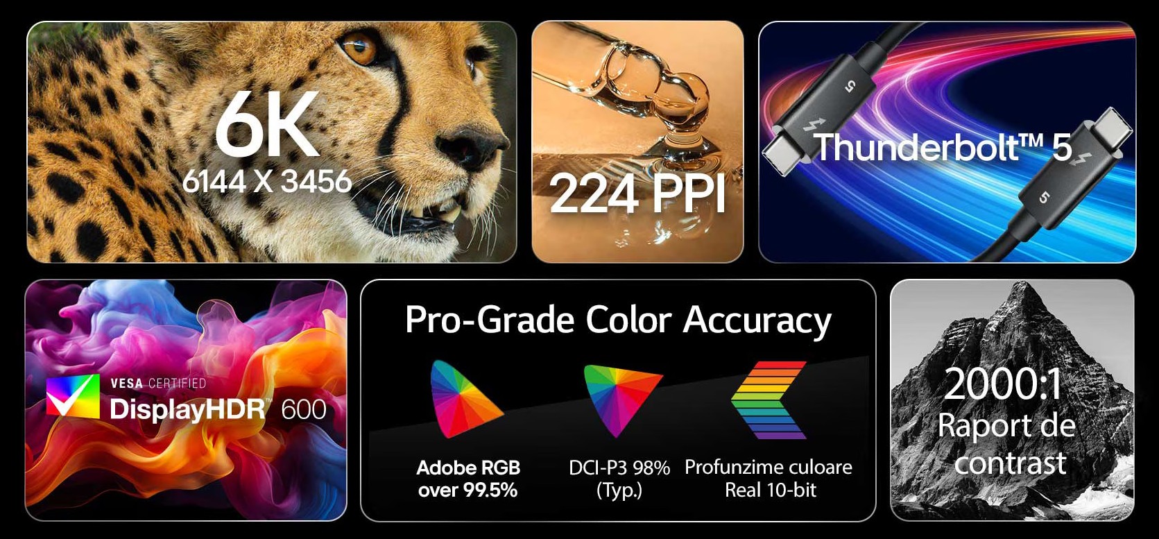 Gir Adobe RGB 99,5 % og DCI-P3 98 % (typ.) dekning, og tilbyr et bredere og mer nøyaktig fargespekter enn standard sRGB-skjermer. Ekte 10-bits fargedybde fanger opp alle nyanser med jevne, sømløse overganger, noe som gjør den ideell for HDR og høyoppløselig kreativt arbeid som krever presisjon.
