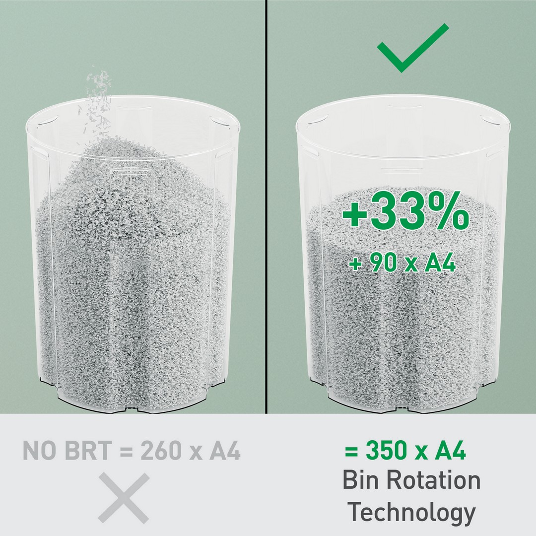 Den roterende beholderen sørger for flat og jevn papirdistribusjon, og forhindrer at papirrester danner en topp i beholderen, slik at ytterligere 90 A4-ark kan makuleres før den må tømmes. BRT betyr at du ikke trenger å fjerne eller riste beholderen; “full beholder”-indikatoren aktiveres kun når den når 100 % av kapasiteten. Den romslige 22L beholderen rommer opptil 350 makulerte A4-ark og lyser blått under bruk.