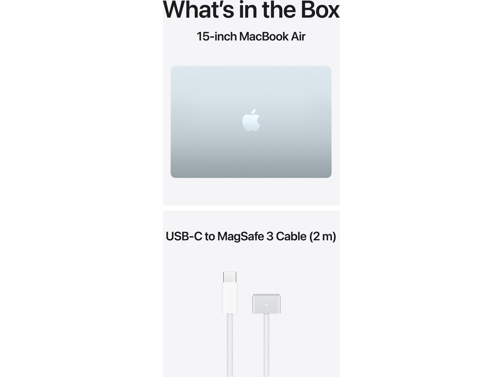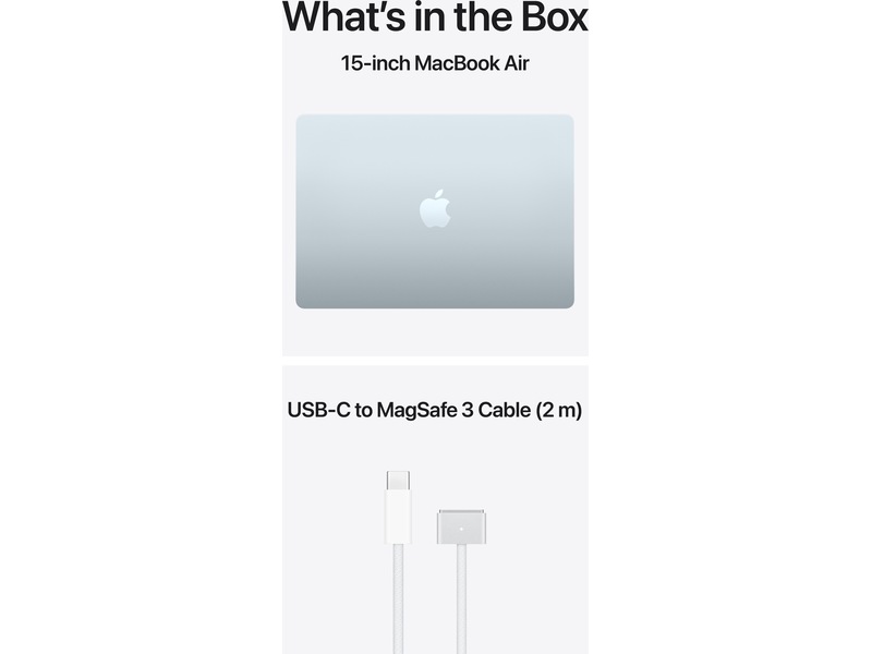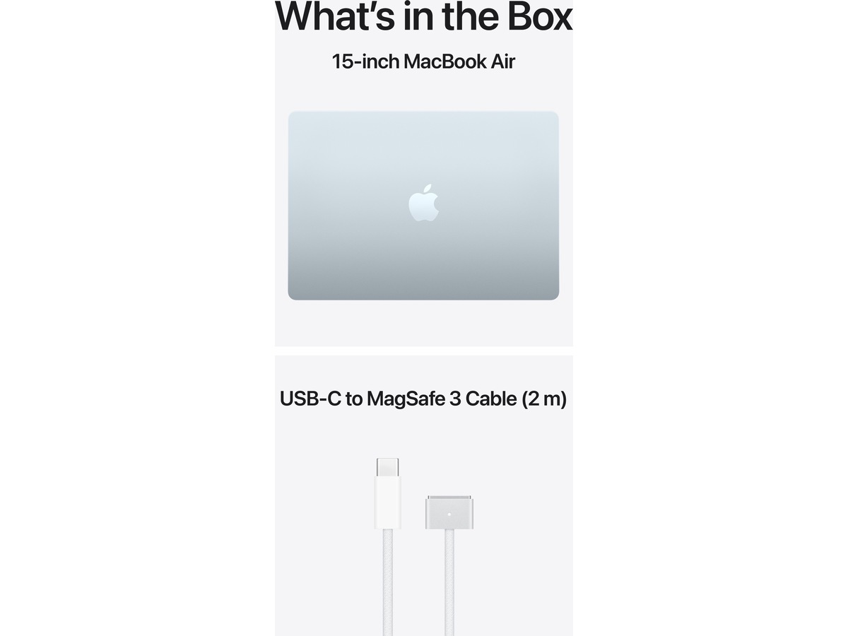 LADERE – Vennligst merk følgende: 15-tommers MacBook Air leveres med en USB-C til MagSafe 3-ladekabel, men lader er ikke inkludert. En USB-C-lader eller annen USB-hurtiglader som kan levere 35 watt eller mer kreves for å lade denne enheten. For optimal lading anbefaler Apple å pare denne Mac-en med en 35-watts dobbel USB-C-portlader fra Apple eller 70-watts USB-C-lader for å dra nytte av hurtiglading (opptil 50 prosent på 35 minutter).(7)