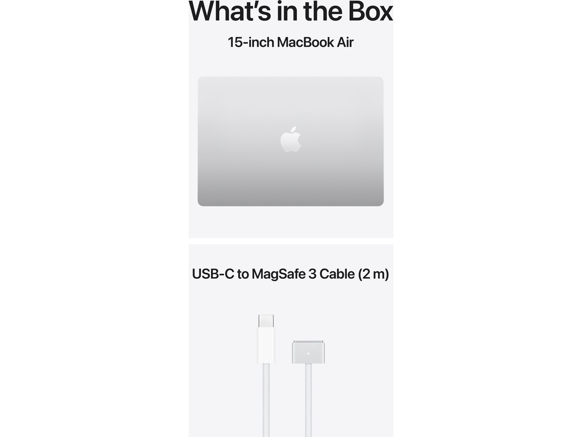 • LADERE – Vennligst merk følgende: 15-tommers MacBook Air leveres med en USB‑C til MagSafe 3-ladekabel, men lader er ikke inkludert. En USB‑C-lader eller annen USB-hurtiglader som kan levere 35 watt eller mer kreves for å lade denne enheten. For optimal lading anbefaler Apple å pare denne Mac-en med en 35-watts dobbel USB‑C-portlader fra Apple eller 70-watts USB‑C-lader for å dra nytte av hurtiglading (lader opptil 50 prosent på 35 minutter).(7)