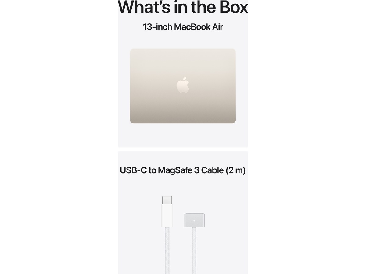 • LADERE – Vennligst merk følgende: 13-tommers MacBook Air leveres med en USB-C til MagSafe 3-ladekabel, men lader er ikke inkludert. En USB-C-lader eller annen USB-hurtiglader som kan levere 30 watt eller mer kreves for å lade denne enheten. For optimal lading anbefaler Apple å pare denne Mac-en med en 30-watts USB-C-lader fra Apple eller 70-watts USB-C-laderen for å dra nytte av hurtiglading (opptil 50 prosent på 30 minutter).(7)