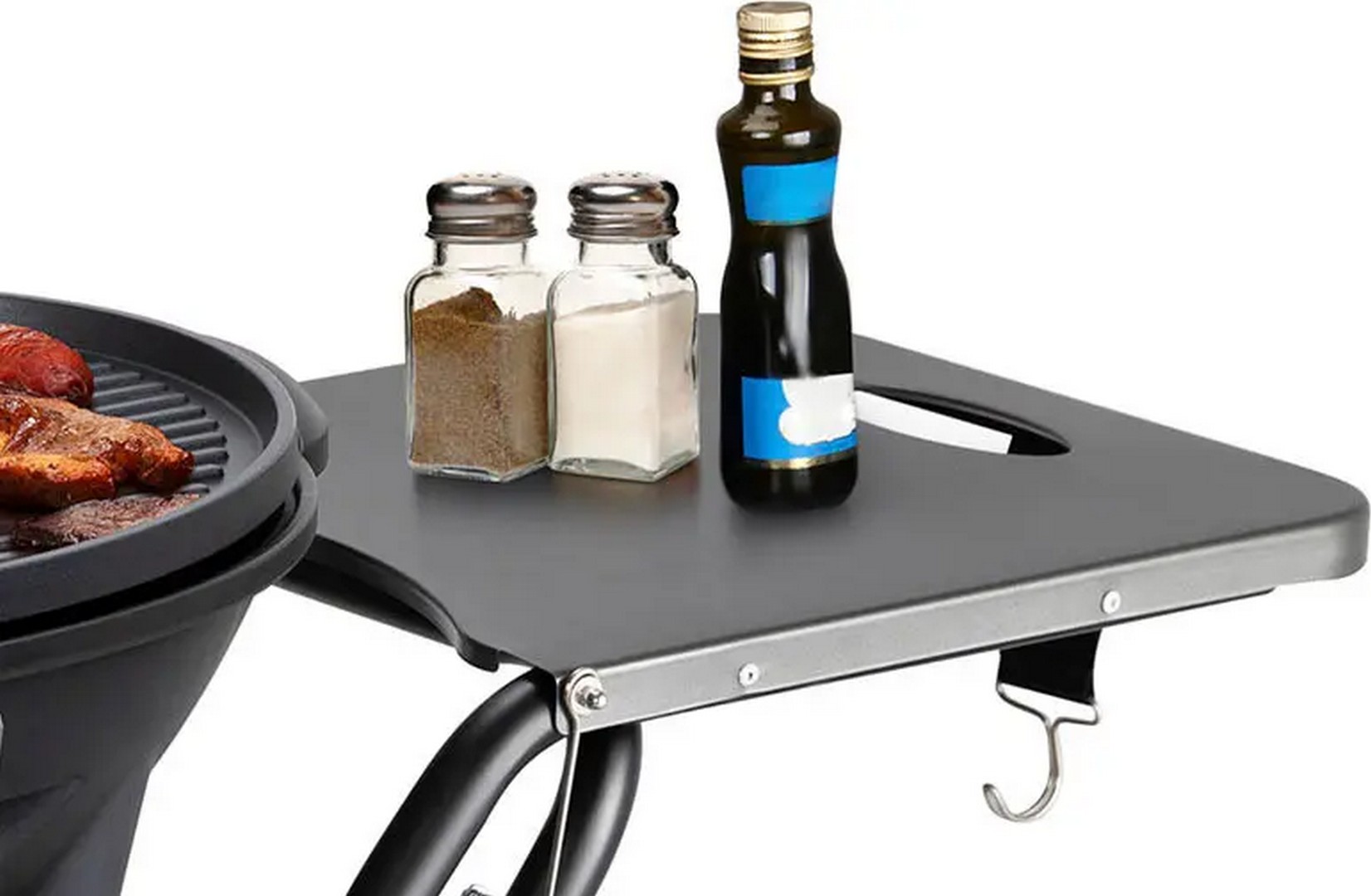 Et sidebord ved grillen er gull verdt og gjør alltid grillingen enklere. Her kan du sette krydder, glaze, grilloljer og marinader, serveringsfat eller en iskald drikk mens du griller. På undersiden finner du også en hendig redskapskrok til grillklype eller stekespade, slik at du bruker minst mulig av bordflaten på større redskap. Sidebordet måler 34 x 37 cm.