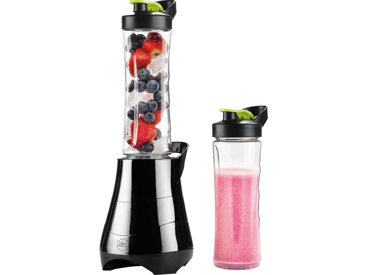 Blenderflaske, blader og lokk kan vaskes i oppvaskmaskin. To 600 ml bjelker med drikketut er inkludert.
