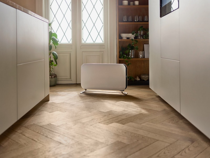 En gulvovn i moderne design med innebygget vifte. Gir rask og effektiv fordeling av varmen.
