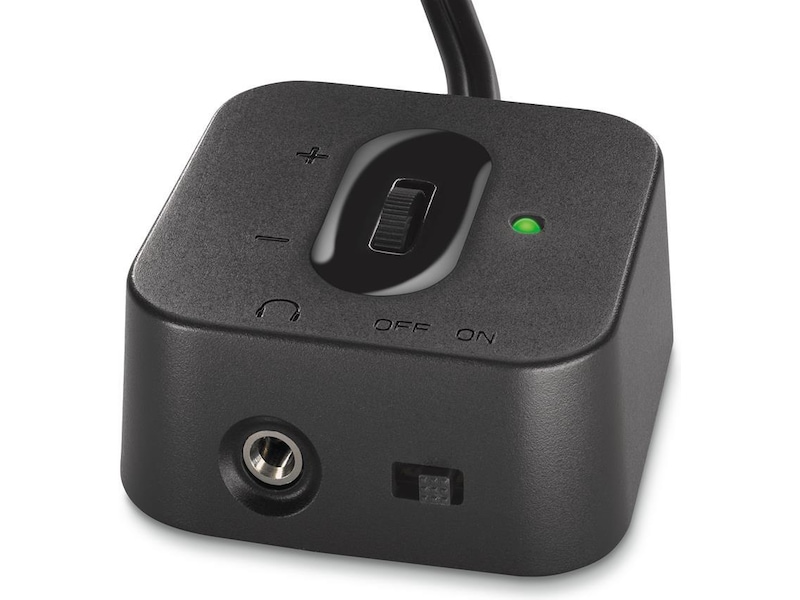 Du trenger ikke å kaste bort verdifull skrivebordsplass for å få god lyd. Den skråstilte utformingen av Z213 fører lyden rett til ørene. - Praktisk kontrollenhet