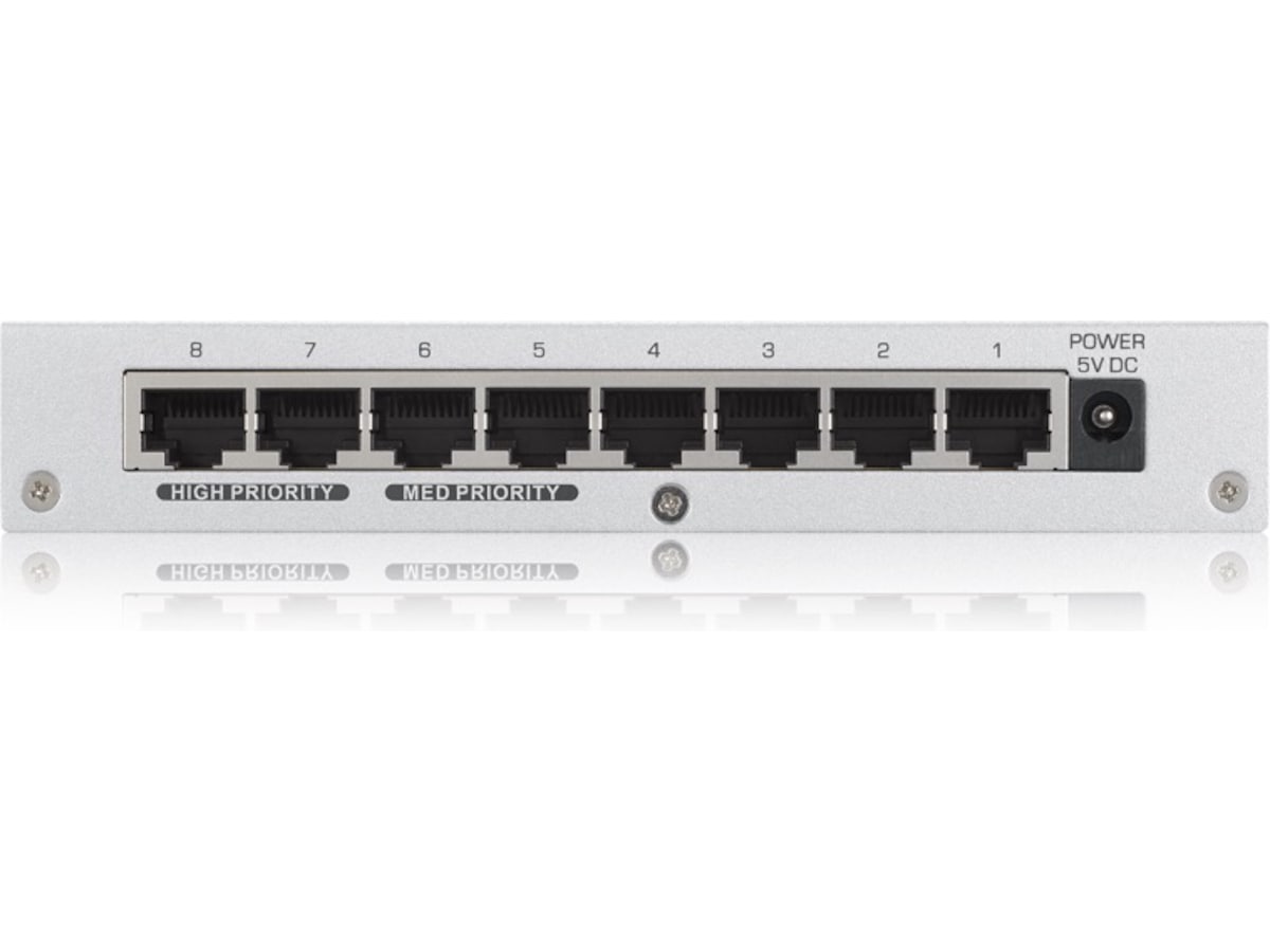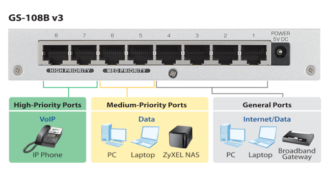 ZyXEL GS-108B v3 8-ports Desktop Gigabit Ethernet-svitsj kobler nettverksenheter og hjemmenettverket sammen med voldsomme Gigabit-hastigheter. De nydesignede QoS-portene garanterer jevn overføring for båndbreddeintensive applikasjoner som VoIP og datakommunikasjon.