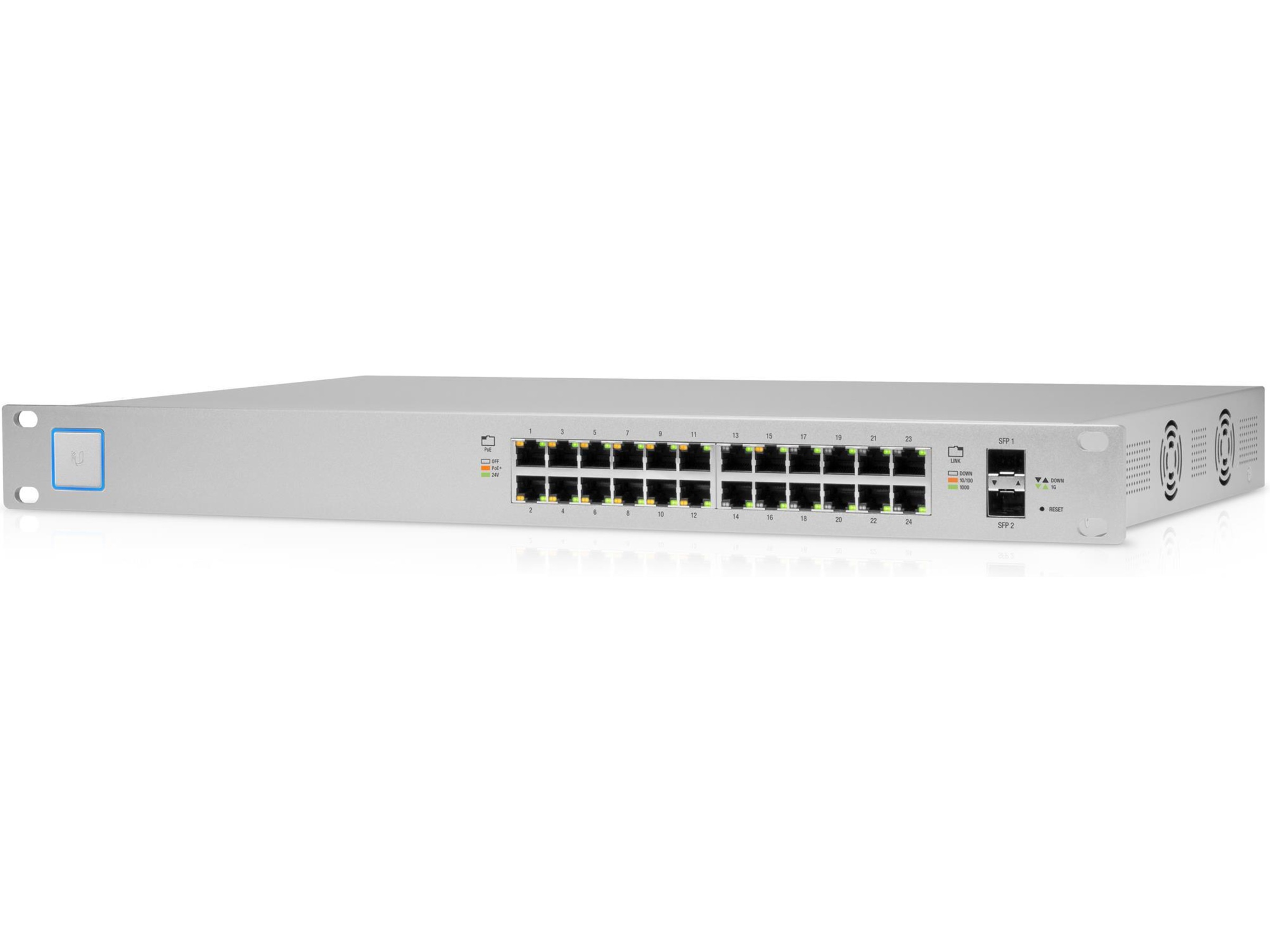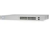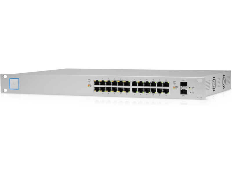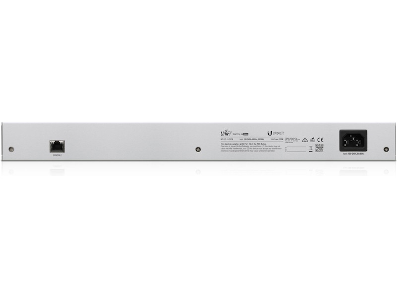 Svitsjen 24 PoE 250W (US 24 PoE 250W), en fullt administrert svitsj med (24) GbE RJ45-porter og (2) 1G SFP-porter. Hver av portene på svitsjen kan gi enten PoE+ eller kan konfigureres, 24 V passiv PoE til UniFi-tilgangspunkter eller andre PoE-enheter. Denne svitsjen kan overvåkes eller konfigureres fra hvor som helst med den kraftige, intuitive nettapplikasjonen og mobilappen UniFi Network.