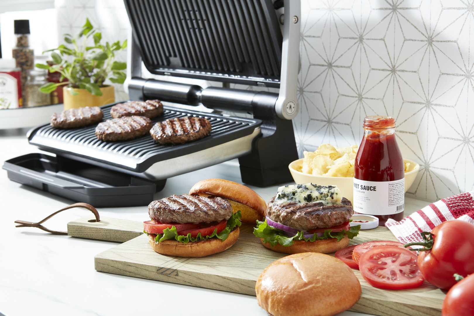 OptiGrill+ XL har 9 automatiske programmer, slik at du enkelt kan tilberede alt fra rødt kjøtt, burgere, pølser og bacon til fjærkre, fisk, sandwicher, paprika og aubergine. Den har også manuelle moduser for frossen eller tint mat. Du trenger heller ikke bekymre deg for røyk, da OptiGrill+ XL produserer opptil to ganger mindre røyk enn en tradisjonell innendørs grill.