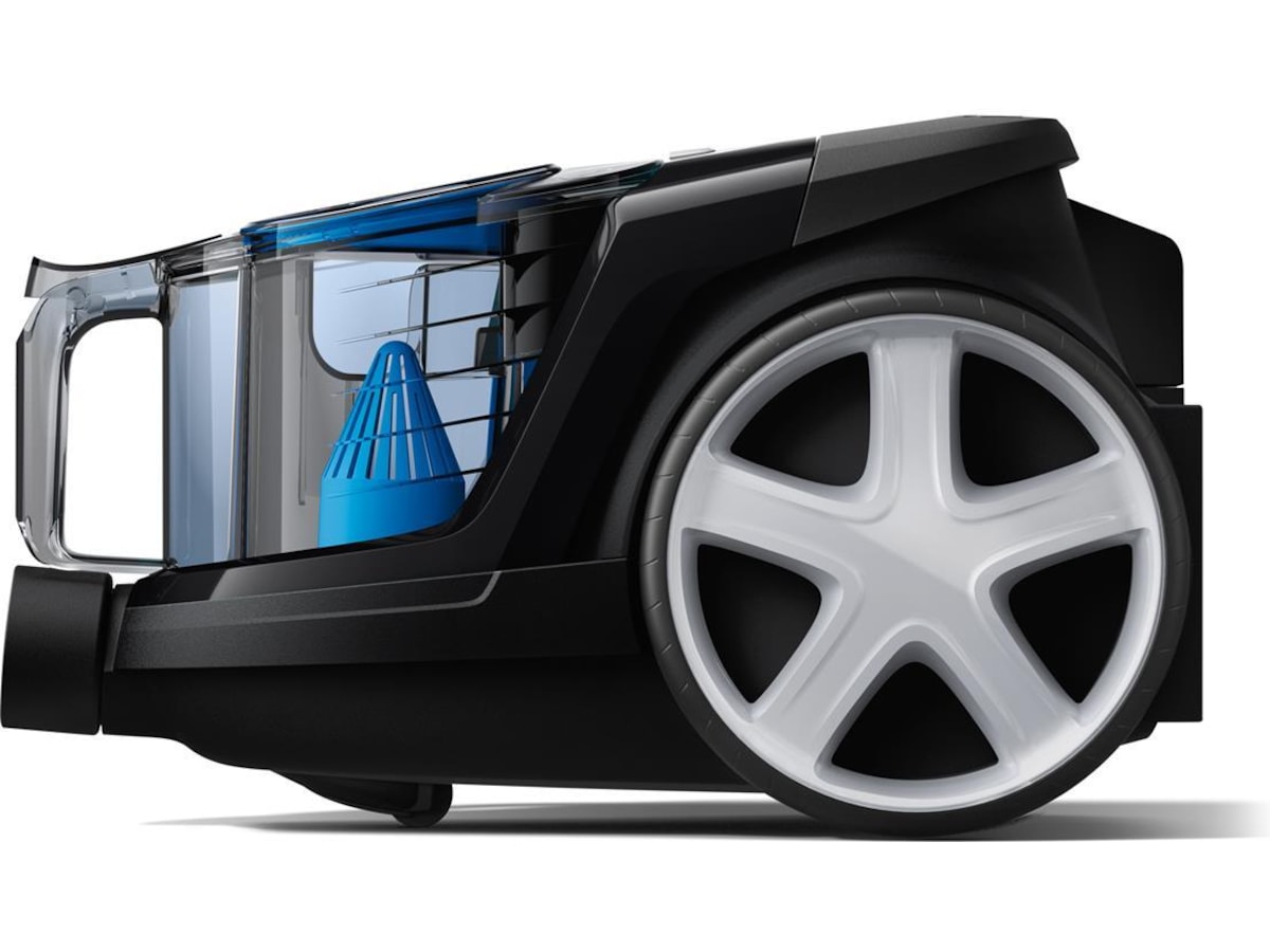 PowerCyclone 5-teknologien maksimerer luftstrømmen og ytelsen ved å skille smuss fra luften i én omgang. Det gir forbløffende gode rengjøringsresultater ved hjelp av svært effektive trinn: 1) Luften går raskt inn i PowerCyclone takket være utformingen av luftinntaket. 2) De buede luftpassasjene akselererer luften raskt i det sykloniske kammeret, og skiller på denne måten støvet fra luften. 3) De optimaliserte bladene skiller smuss fra syklonen og ned i støvbeholderen.