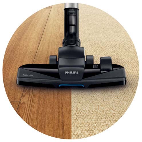 TriActive-munnstykket aktiverer tre rengjøringsoperasjoner på én gang: 1) Det åpner teppet skånsomt med den spesialutformede strykesålen som fjerner støv som sitter dypt. 2) Det suger opp store biter med den større åpningen foran. 3) Det samler opp støv og smuss nært inntil møbler og vegger med luftkanalene på venstre og høyre side.