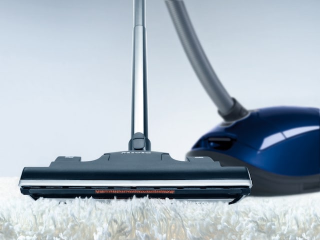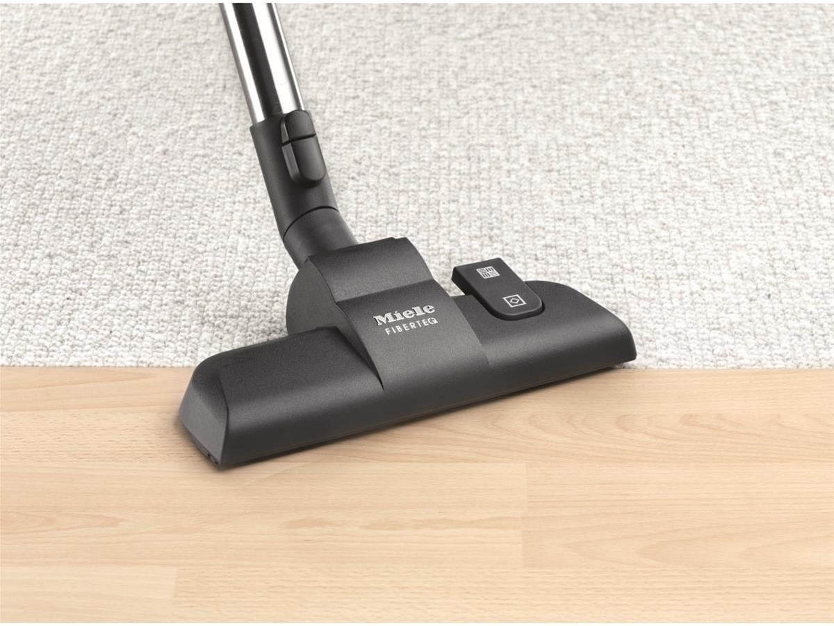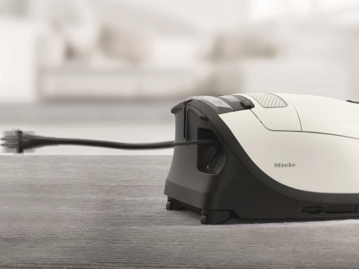 Gulvmunnstykket henges enkelt og greit på baksiden av støvsugeren slik at sugerøret står sikkert og bruksklart i arbeidsposisjon. Miele Complete C3 kan også stues vekk på en plassbesparende måte, og har hele 12 meter aksjonsradius.