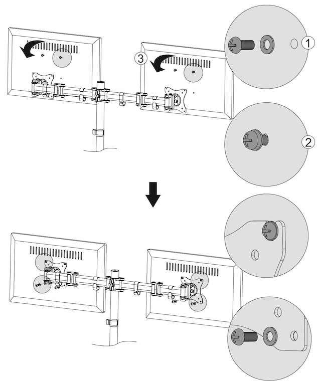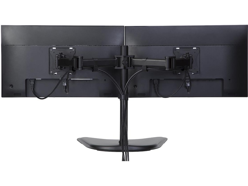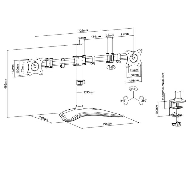 Dette skjermstativet leveres med en 75/100 mm VESA-plate med 360-graders rotasjon. Det lar deg sette skjermene i enten liggende (horisontal) eller stående visning (vertikal).
