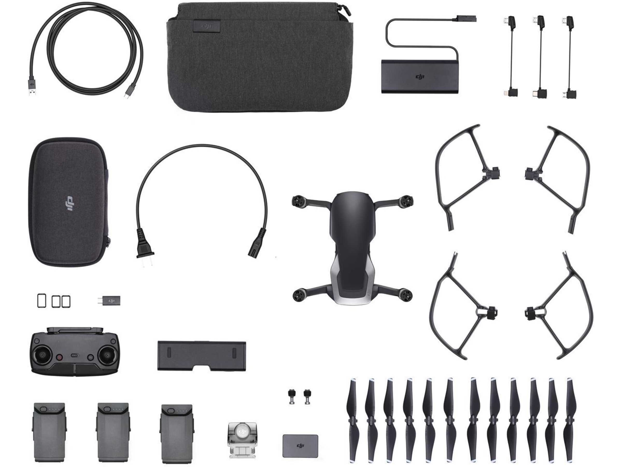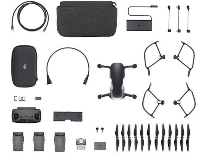 Mavic Air leveres som to utgaver, en Fly More Combo og en vanlig. Forskjellen er medfølgende tilbehør. Dette er Fly More Combo utgaven, her får du bl.a. med to ekstra batterier og ladehub. Se komplett tilbehørsliste nedenfor.